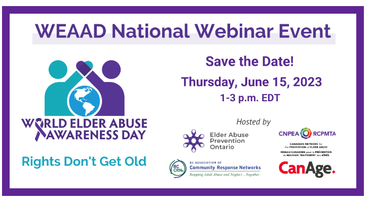 Since 2006, communities throughout the country and around the world have honoured this day to raise the visibility of elder abuse by organizing events to share information and promote resources and services that can help increase seniors’ safety and well-being. Elder Abuse networks and other organizations are planning multiple WEAAD activities across the country to mobilize community action and engage people in discussions on how to promote dignity and respect of older adults.