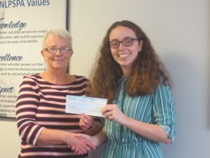 Taylor is presented with her scholarship by Mary Cleary, Chair of NLPSPA Scholarship Committee