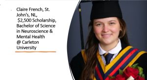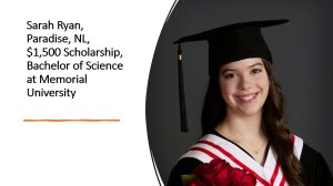 - Amy Manning, St. Philip’s, NL, $1,500: pursuing a Bachelor of Science Degree in Human Biosciences, MUN, NL.